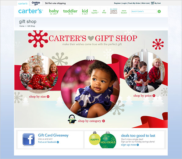 Carter's & OshKosh B'gosh introduced the 2011 holiday season with a combination of beauty, charm and playfullness. The website experiences aided consumers in choosing the perfect gift by size, category or price. A "Wish Big, Win Big" Facebook campaign ran concurrently, offering consumers incentives with weekly drawings for gift cards ranging from $50 to $100.