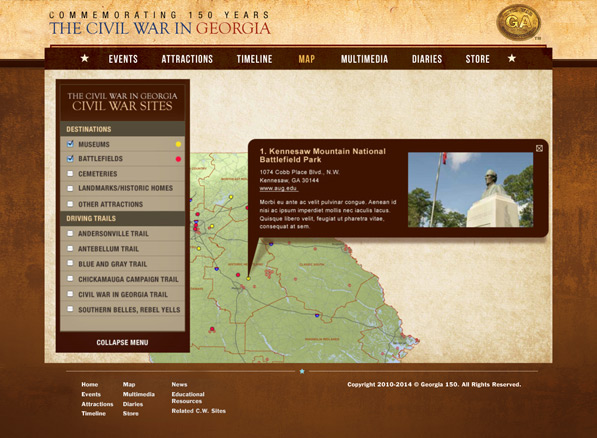 An interactive map allowed consumers to search by museums, battlefields, cemetaries, landmarks and/or attractions, and mapped out historic driving trails.
