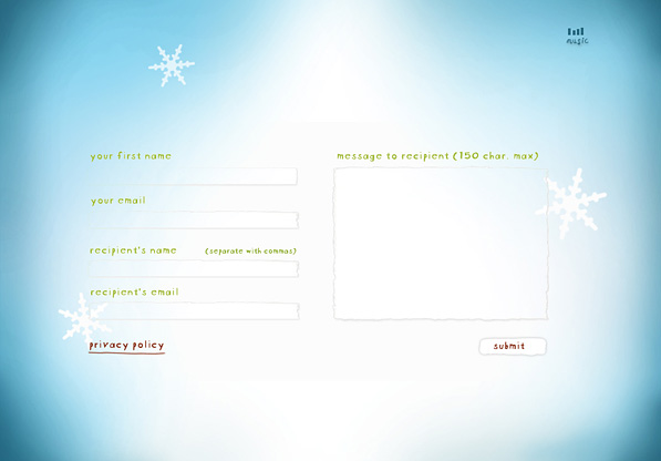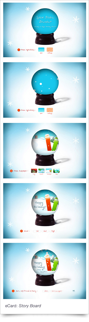 The interactive, musical and socially integrated experience allowed users to choose a vacation destination (beach, mountain, lake, golf, or city), select a personalized holiday message ranging from "Merry Christmas" to Happy Kwanzaa," and select volume of snow or glitter from "dusting" to "blizzard."
