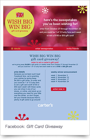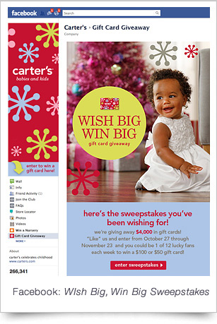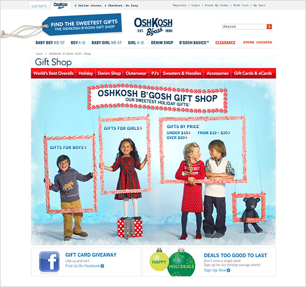 Carter's & OshKosh B'gosh introduced the 2011 holiday season with a combination of beauty, charm and playfullness. The website experiences aided consumers in choosing the perfect gift by size, category or price. A "Wish Big, Win Big" Facebook campaign ran concurrently, offering consumers incentives with weekly drawings for gift cards ranging from $50 to $100.