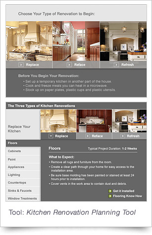 The new design resulted in a dramatic increase of time spent per page, engagment with the interactive tools, additonal click throughs, and appointments with The Home Depot design consultants.